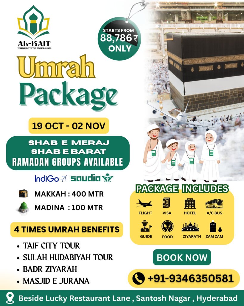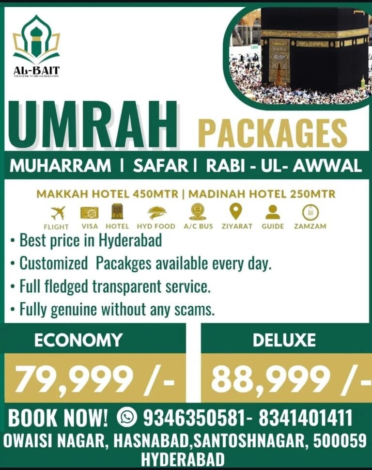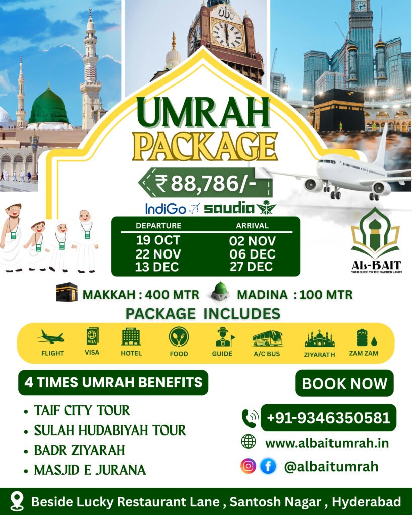 KNOW MORE KNOW MORE KNOW MORE Happy Customers 0 Packages Starts From 0 K Umrah Booking Form Umrah Booking Form Full Name Email Address Phone Number Select Package Select your package Basic Package Deluxe Package Premium Package Additional Notes Submit Booking Services Hajj & Umrah know More Ziyaratein know More Visa Processing. know more Flights know More Accommodation know More Transportation know More Guide know More Support know More Packages BOOK NOW BOOK NOW BOOK NOW BOOK NOW BOOK NOW GET QUOTE Name Email Phone Number Message SUBMIT OFFICE Facebook Instagram Envelope